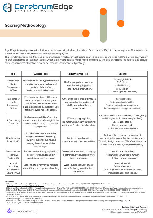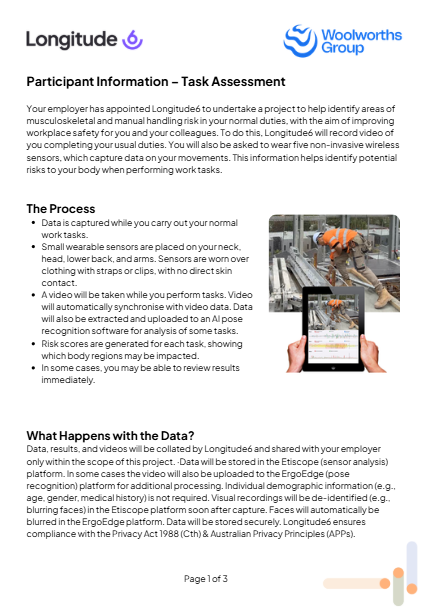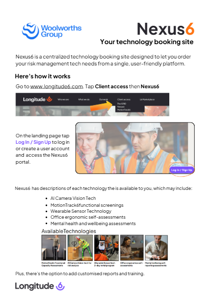 Welcome to the Nexus6 resource library for Woolworths Just tap the document to open. AI Camera Vision Technology Etiscope Wearable Sensor Technology MotionTrack6 Functional Screening Assessments ErgoAssess Office Ergonomic Self-Assessments Emotii Nexus6 Utilisation Tools Data Security